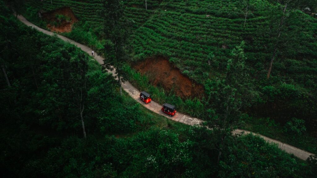 We starten in Negombo, waar je meteen leert hoe je een tuktuk veilig door het verkeer loodst. De volgende ochtend rijden we richting Sigiriya in het noorden, waar je de legendarische Lion Rock kan trotseren. Daarna duiken we de jungle in naar Kandy, bekend om z’n heilige tempel, en cruisen we door naar Nuwara Eliya en het schitterende Ella – midden in de theevelden.
